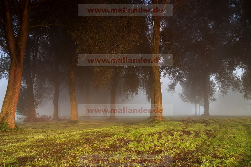 Eine lockere Baumgruppe bestehend aus Weiden wird von der flach stehenden Sonne angeleuchtet. Die einzelnen Bäume verschwinden nach hinten hin in den Nebel. Die Baumkronen wirken dunkel und beängstigend.