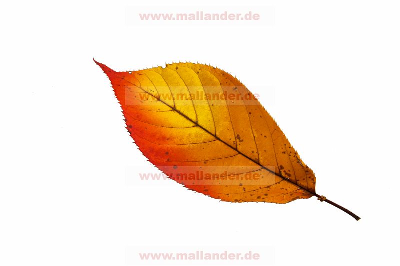 Ein herbstlich verfärbtes Laubblatt als freigestellte Makroaufnahme.